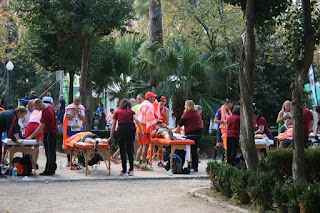 Robert, viene con su muslo izdo vendado, le pregunto, me cuenta, que lo han tenido que traer en la ambulancia, está desolado, lo ánimo todo lo que puedo, lo cuelo en las camilla de los masajistas, bueno la gente que había esperando para darse su masaje, no pusieron ninguna pega esto es running y aquí el compañerismo es digno de admirar. Eres muy joven Robert y te quedan todavía muchas guerras de estas, que ganar.