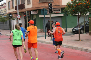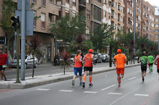 Salimos del centro, vamos por una avenida larga donde al final giramos 180 grados y tenemos las referencias de los que vienen por detrás, veo a Pablo, está relativamente cerca de nosotros le veo muy bien., más atrás a Luismi, también le veo bien, nos damos ánimos, entonces paro a mear otra vez ,km-15 prosigo la marcha , Pedro no se había dado cuenta mira para atrás , me ve a lo lejos, rápido se deja caer, hasta donde estoy , me dice que pasa? Le digo que he parado a mear, me responde a pensaba que pasaba algo, poco a poco fuimos volviendo a coger al grupillo.