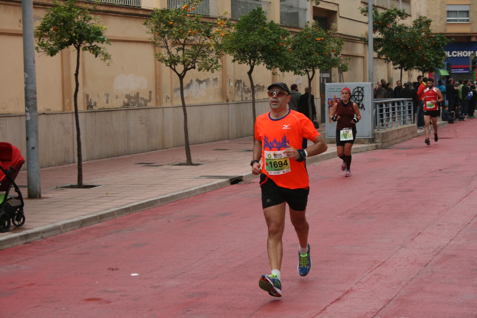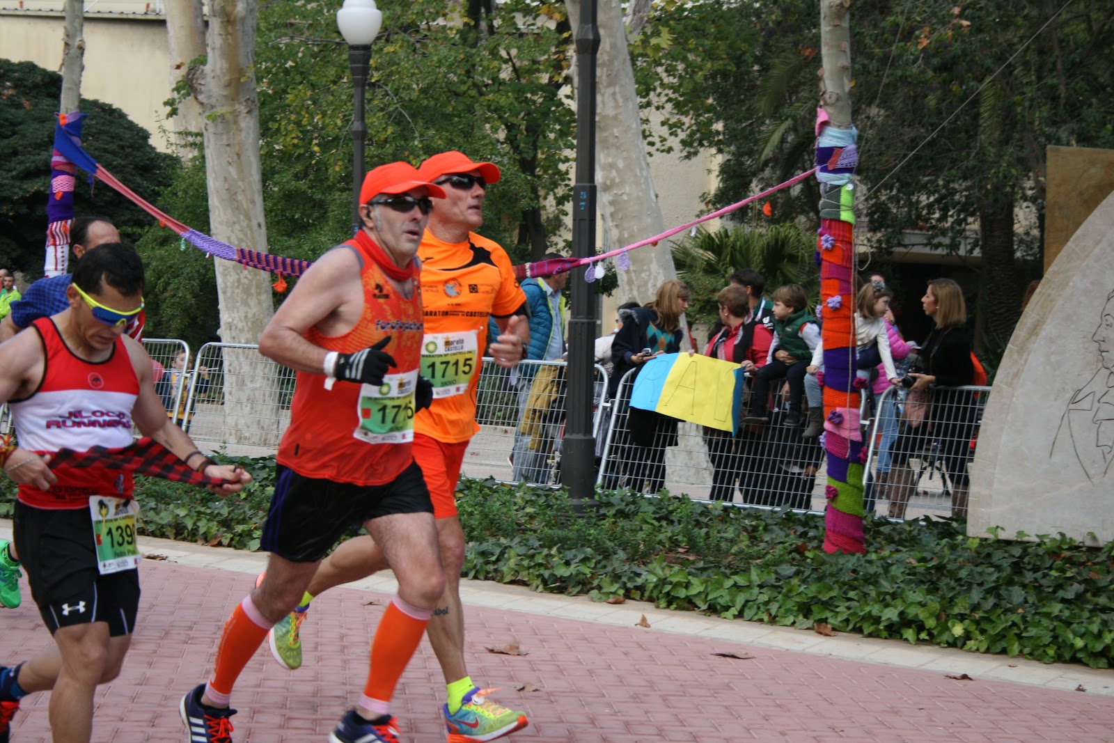 Faltando 4 km, me tomo el último gel, estamos en pleno centro de Castellón, entre tantos giros, idas y vueltas vemos animando a Fran, su mujer, Pili mujer de Ramón en distintos sitios, a los míos, a Luis Backs, que estaba en una rotonda por donde pasamos tres veces (Muchas gracias a todos por esos ánimos) esto ayuda tanto o más que un gel con cafeína.