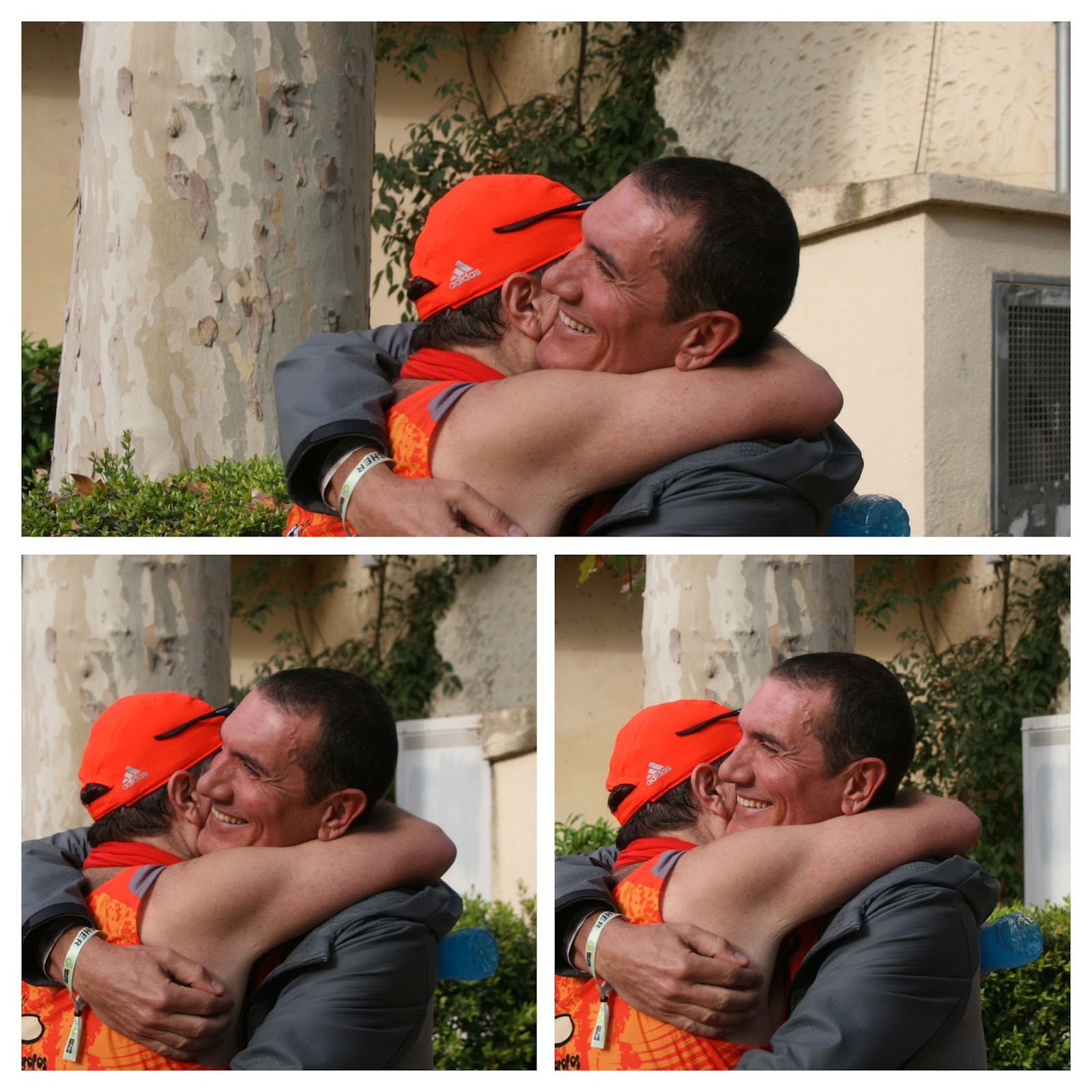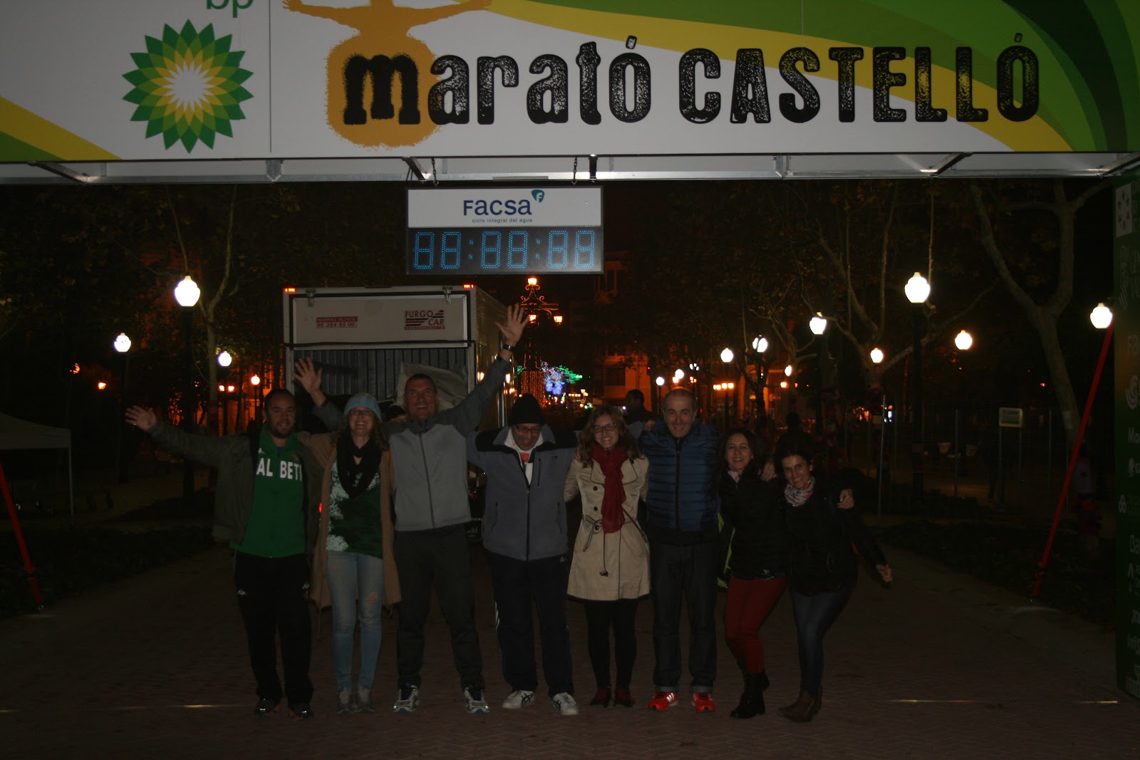 Solos Pedro y yo , oigo la megafonía de Meta, nos quedan dos giros y entramos en el parque ribalta, la meta está al final, es bajada, 1500 arcos, al fondo el reloj, que la tarde de antes soñaba con que hubiera un 3 delante, me vocea Pedro; mira Runni, mira el reloj, vamos a entrar por debajo, en el tiempo bruto también, veo ese reloj que marca un 3 delante me pongo supercontento, último sprint, veo a los míos en el lateral animando, tan contentos como yo, saben que lo voy a conseguir, le doy la mano a Pedro para entrar juntos, miro el reloj 3:59 y pico, al fondo en Meta, Pablo, Ramón, Iván con los brazos en alto esperándonos (ese momento lo tendré siempre grabado en mi recuerdo).yo estaba contento, pero ellos más, pasamos el arco con una sonrisa, pego un puñetazo de rabia hacia arriba, por fin... por fin!!!Nos damos un abrazo los cinco en meta, lleno de rabia, emoción y alegría, que nunca se me olvidará, ese abrazo fue, no se como explicarlo, hay que vivirlo.